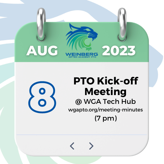8/8/2023: PTO kick-off meeting @ 7pm WGA campus/Tech Room. Agenda here >