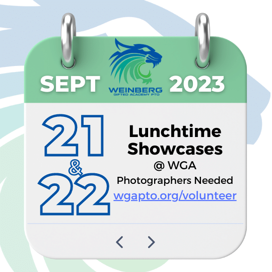 9/21 & 9/22/2023: Lunchtime Showcases @ WGA. Parent volunteers needed to take photos of the acts (digital camera provided). Volunteer here>